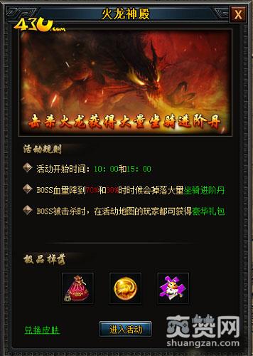 进入火龙神殿后,在神殿中心有一个BOSS,当BOSS血量到70%和30%的时候,BOSS会掉落大量的坐骑丹,BOSS被击杀后,BOSS掉落大量坐骑丹,装备和羊驼碎片。在场的所有玩家都可以获得一份参与礼包,开启礼包可以获得10-20个坐骑丹。