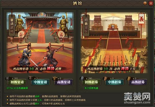 在战场之中最重要的莫过于有强大的兵力,无论是武将还是士兵都是你征服天下的最好帮手,玩家可以在酒馆之中使用招募令来招募武将和士兵,招募打到一定的次数还能百分百获得神级士兵和神级武将,属性技能更加强力战场之中无人能敌!
