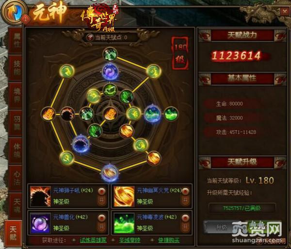 开服45天且元神技能等级达到26阶10级,可开启元神天赋系统,消耗元神天赋经验可提升天赋等级。元神天赋等级每提升2级可获得1点天赋点,天赋点可用于强化元神技能、激活天赋槽、激活元神终极技能。天赋槽可放置特殊属性装备-天赋石,同类型天赋石只能装备1个,天赋石的技能等级加成对未激活的元神技能不生效。