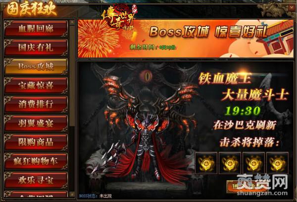 活动期间,每天19:30将在沙巴克刷新铁血魔王和大量魔斗士;击杀BOSS可大量掉落各类材料,每天都不同哦!
