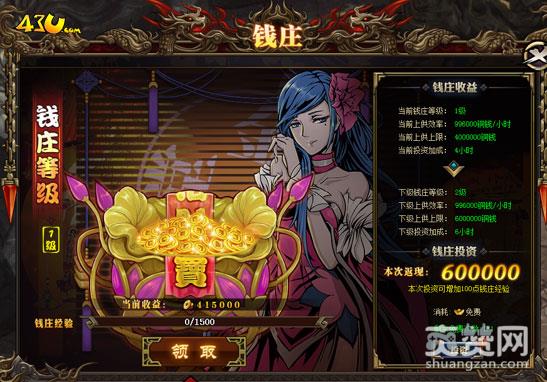 在钱庄开启后每小时可上供大量铜钱,直到达到上供铜钱数量上线,玩家离线后仍会上供。而且玩家通过投资可直接获得大量游戏币及钱庄经验,每日可免费投资一次,使用元宝则能够提升多次,主要还是看各位小伙伴的财富值啦!