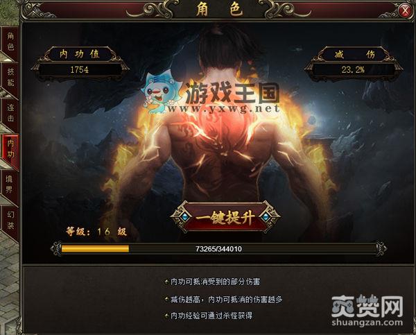 游戏王国《屠沙荣耀》增加了许多角色养成的内容,这大概是受当前的流行风向影响。开始游戏后,玩家除了能通过升级、技能等方法来养成主角,还能通过内功、境界、幻装等方法来提升主角,并且还可以使用特殊的技能书来激活连击技能。