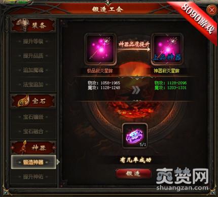 在游戏中,极品神器可以进行神器的锻造,必须是神力5阶以上的装备可以与神器之魂,进行锻造成为上品神器,这样就可以获得巨额属性加成与神器技能的效果,当然只有融合神器之魂的装备,才能算得上神器。另外上品神器还可以继续的使用锻造神器之魂升级成为精品神器和极品神器。