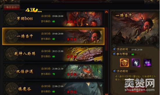 43u《北斗神兵》一骑当千活动在每天19:40-20:00这个时间段开启,60级以上的玩家可以参与该活动,在这里可以获得绑元元宝、经验、玄兵精华等道具。