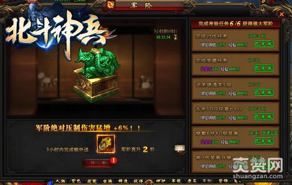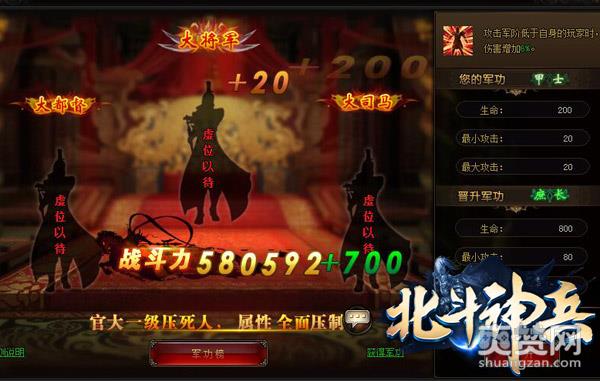 游戏中,玩家军阶每升一级,属性就每强一成,并且每次军阶属性加成都针对着诸如最小攻击、最大攻击、生命这样的实战型属性,令玩家在战场上更胜人一筹。更刺激的是,《北斗神兵》军阶还具有绝对压制的设定,即高军阶对低军阶形成属性的全面压制,也就是说哪怕你级别再高,只要军阶比我低,就赢不过我!