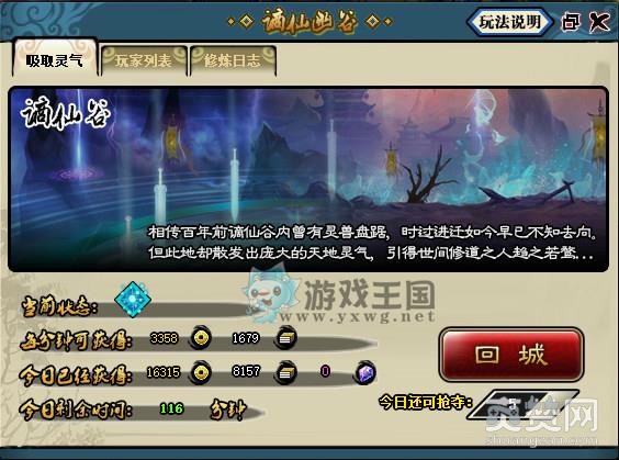 谪仙幽谷是仙家吸取天地灵气的好去处,玩家进入这里后,将会自动挂机修炼。在谪仙幽谷修炼时,玩家每分钟都可以获得一定数量的铜钱和阅历,如果玩家使用上“古神的赠予”的话,还可缩短一半修炼成果的收获时间。
