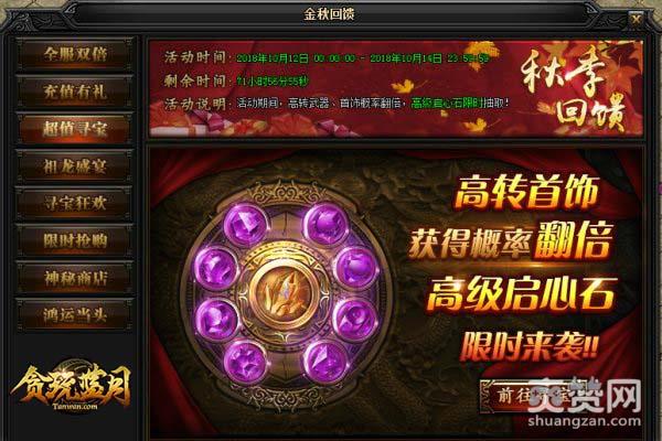 10月12日~10月14日,《贪玩蓝月》秋季回馈福利来袭,8大惊喜活动享不停。活动第一天,全服双倍经验活动全天开启,海量经验轻松得。超值寻宝,高转武器、首饰概率翻倍,高级启心石限时抽取!而且在龙族寻宝中,每寻宝5次,可额外获得1点祖龙之力,获取无上限,寻宝次数达指定次数,更有额外大礼。累积消费指定元宝还可以领取海量奖励,你还在等什么呢?