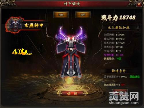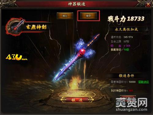 43u《天威传说》玩家们可以在游戏界面下方点击“神器”按钮,火按下或按下快捷键(X)即可打开神器系统。此时界面打开,默认显示的是神兵界面。左侧显示神兵的名称,右侧显示对应的神兵的战斗力、永久属性加成和铸造条件,当然也可切换至神甲界面查看相关信息。