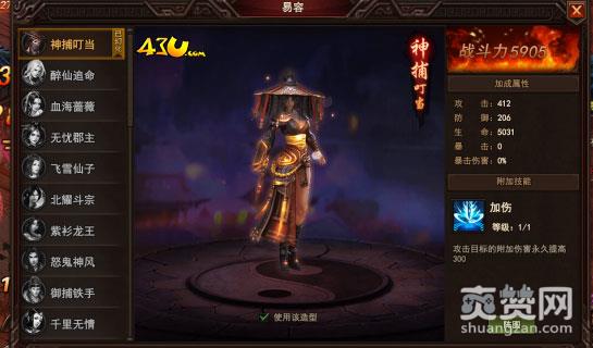 在易容界面,我们还可以看到十大易容皮囊,其中就包含了四大名捕中的三位,铁手、无情、追命,化身为他们的形态行走江湖可是方便不少!其中追命的战斗力高达一万二,同时还有一个额外的治愈技能可以使用。