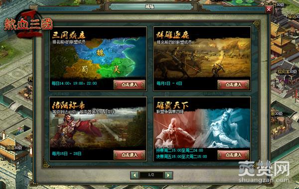 顶级策略网页游戏---《热血三国2》传承《热血三国》经典玩法,全面升级的华丽画面与极速性能,更提供名将传奇、多线剧情、换装展示、君主竞技、激爽盟战、称霸天下等全新的特色系统。20种建筑、17大兵种,单场战斗最多5名将领联合组成军团出征,控制士兵部队多达40支,为战斗带来无穷变数,是一款直指战争策略巅峰的大作。