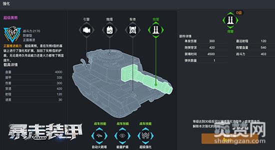 “超级黑熊”拥有三个主动技能:自动火箭塔、能量护盾、超级强化。在强化界面中,玩家可以使用超级黑熊图纸来强化这些技能。除此之外,玩家还可以强化超级黑熊的引擎、炮塔、车体、炮管四大部件,使装甲获得更多属性能力。