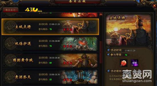 43u《北斗神兵》主城点将活动在每天下午15:00-15:20这个时间段开启,等级达到70级的玩家都可以参与,在主城点将活动开启后,玩家们进入主城点将的区域,可以获得大量经验和军功值的奖励。