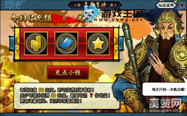 在每日首充中,玩家只要充值到50元宝,便可以获得1次抽奖的机会。而在这个抽奖中,玩家最少可以得到1倍收益,即额外得到50元宝。如果玩家能够福至心灵,得财神眷顾,更可以收获最高的7倍收益和海量的铜钱、阅历、荣誉。