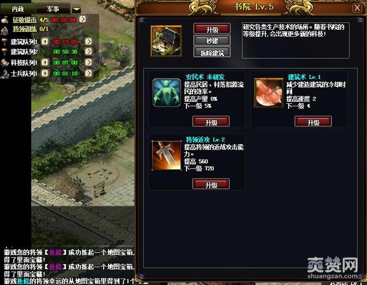 除了战场秀英姿,内政经营也是衡量一名明君的标准。政厅乃一城之本,可作为首升,同时注意武将不能高于政厅10级哦。其他还有兵营、书院、校场、民居、道具店、武器店等作为辅升。