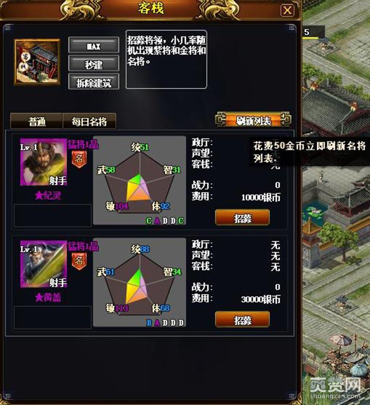 玩三国,怎么少得了招兵买马。历史名将,草根悍兵,享受集邮般的快感。《霸业传》客栈里,普通招募、每日名将两种招募方式丰俭由人,每天免费刷新一次紫色猛将以上的武将。