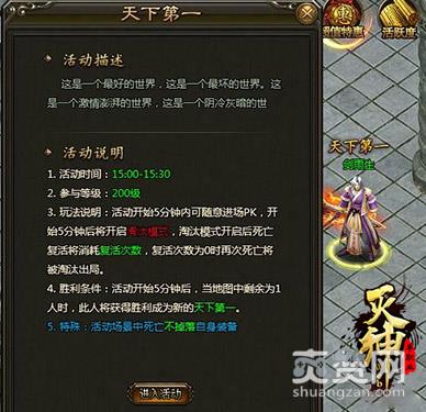 萝卜玩《灭神》天下第一NPC:可以通过圣妖城NPC(149,50)打开进入界面,200级玩家可以参与灭神天下第一活动,活动开启5分钟内可随意进场PK,开启5分钟后将开启淘汰模式,淘汰模式开启后死亡复活将消耗复活次数,复活次数为0时再次死亡将被淘汰出局。