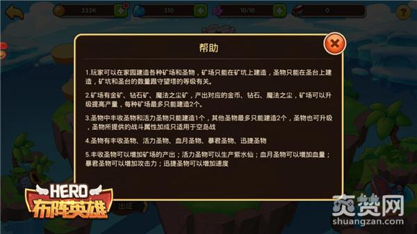 63《布阵英雄》悬空岛上的矿场有金矿、钻石矿、魔法之尘矿,皆能产出对应的金币、钻石、魔法之尘,矿场同时还可以升级提高产量,而每种矿场最多只能建造2个,圣物中丰收圣物和活力圣物则只能建造1个,其他圣物最多只能建造2个。