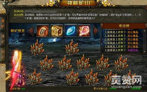 要想挖矿,首先得有装备。在神秘矿山活动期间,大家每提取1000元宝即可获得1个矿锄。在进行挖矿时,每挖掘1次铜矿、银矿、和金矿分别消耗1、5、10个矿锄,越高级的矿堆可挖出的奖励越丰富,获得极品道具的几率也越大。