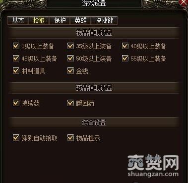 在技能设置中,大家可以设置所属职业的技能。如果在智能挂机的时候想使用某种技能的话,可自行勾选选项。而自动拾取,主要是在战斗中自动拾取物品,需要自动拾取的就点击勾选。若不想要那些低级的装备,可以直接勾选高级的选项。