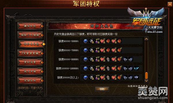 玩家进入37《大天使之剑》时可在界面上方看到军团特权的活动标志,点击进入即可在左侧看到此次活动的各种福利。以前在37《大天使之剑》中充值过的玩家可根据自己的充值金额,在“回归大礼包”中领取相应的奖励,充值越高,奖励越丰富!
