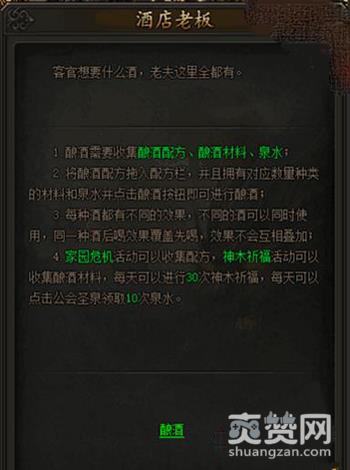 酿造成功可以获得不同的酒,不同酒有不同属性加成,不同的酒使用效果可以叠加,同一种酒效果后喝覆盖先喝,酿酒配方通过参与家园危机活动获得,酿酒材料通过神木祈福活动获得,泉水通过公会圣泉活动获得。