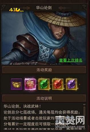 43u《太极崛起》华山论剑要求玩家们等级达到50级,活动开启时间是每天的19:00-19:30,此次论剑一共分为七层战场,玩家们每抵达一层都会获得奖励,可以通过击杀敌人去到更高层。处于活动场景或击杀玩家均可获得积分,积分每累计一定程度后可领取一次额外奖励。