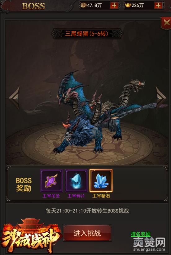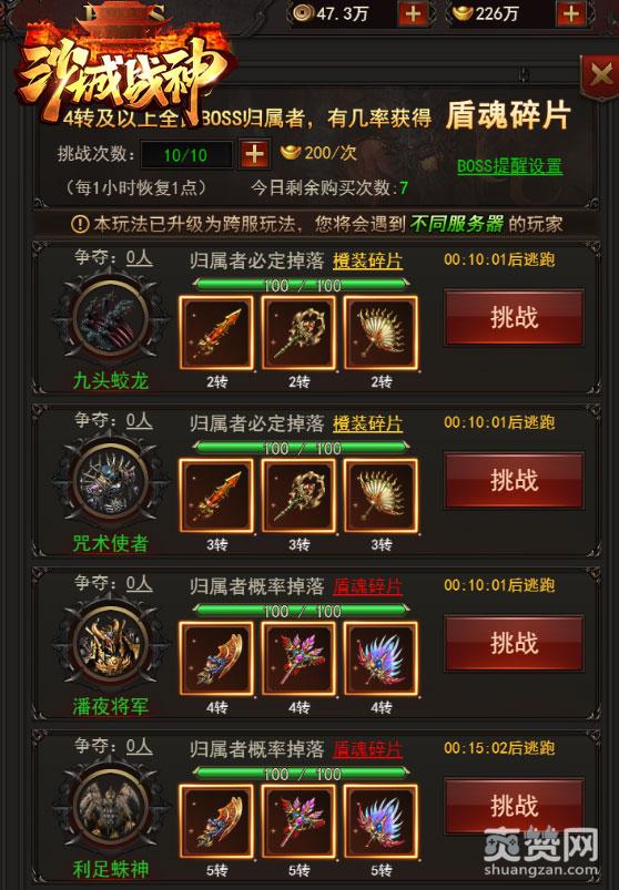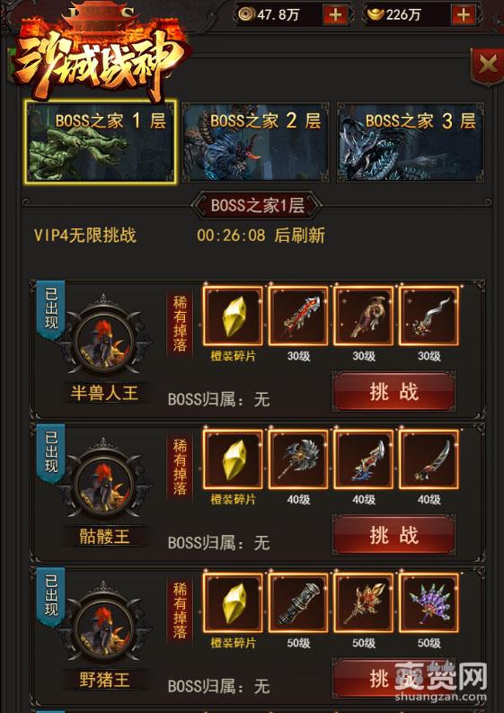 参与个人BOSS可掉落对应等级的各品质装备,还有几率掉落橙色装备和橙装碎片。个人BOSS挑战次数每天0点重置。