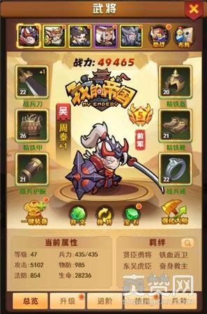 37《我的帝国》的武将系统可以看到目前你所拥有的英雄,打开界面,可查看英雄的战斗力还有各项属性,正下方还有4个提升英雄实力的办法,分别是:升级、进阶、技能、兵种,玩家可要注意了,英雄穿什么样的装备可是决定一场战役胜败的关键因素哦!所以大家要着重强化装备才行。