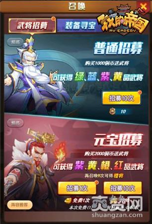 红色武将是37《我的帝国》里实力最强的武将,当你觉得拥有的武将实力已经达到瓶颈时,不妨点开召唤系统,开启武将招募,这里有两种招募方法,一种是铜币招募,另一种是元宝招募,玩家可根据自己的实际情况来选择哪种方法比较适合自己哦!