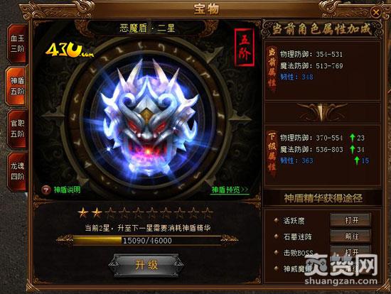 神盾可增加角色的防御、韧性和免伤属性,通过消耗神盾精华可对神盾进行升星,升星后将进一步提高对应的属性增益。通过参与噬魂系统、石墓迷阵活动、击杀野外BOSS及神威魔域活动都可以获得神盾精华,也可通过参与系统活动或者直接从商城购买神盾精华。