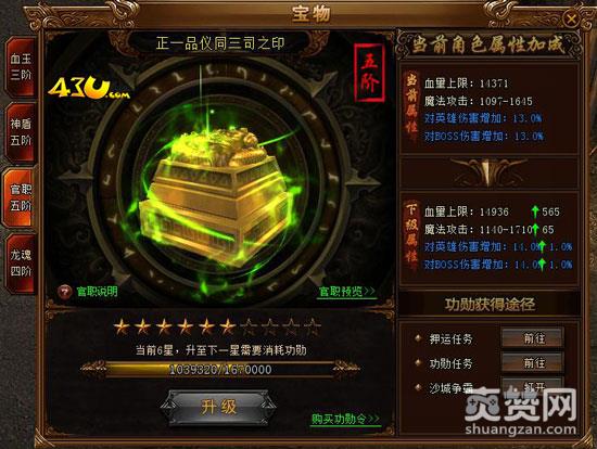官职可增加角色的攻击属性、生命值和额外伤害属性,通过消耗功勋可对官职进行升星,升星后将进一步提高对应的属性增益。通过参与押镖活动、功勋任务、沙城争霸活动都可以获得功勋值,也可通过参与系统活动或者直接从商城购买功勋令并使用获得功勋值。