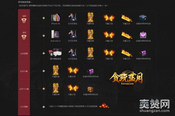 本次贪玩蓝月第五届巅峰赛的赛事奖励,也是相当丰富的咧,而且还有双重奖励,一是游戏内的战队奖励:
