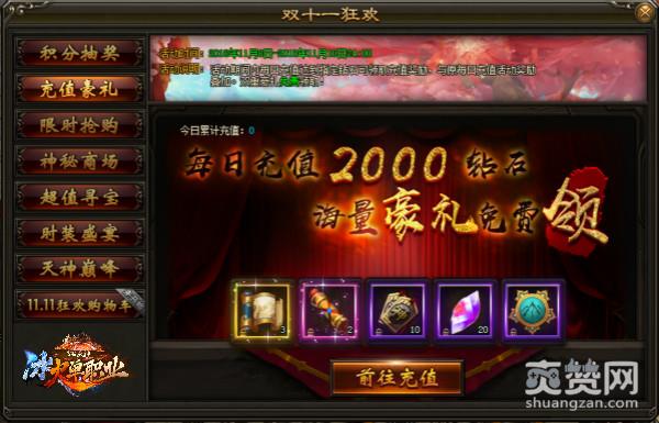 活动期间内,每日充值达指定钻石数额,即可领取充值奖励,可原每日充值奖励叠加领取。有两档奖励可领取:2000钻石、20000钻石。每档都有丰厚豪礼,心动就行动吧!