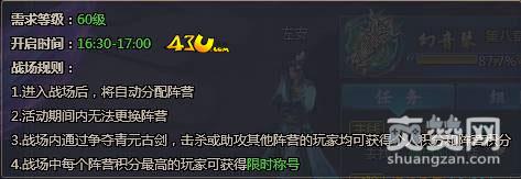 43u《御魂九霄》青元剑阵是单服PVP活动,等级达到60级的玩家皆可参与,活动时间是每天的16:30-17:00,进入该活动的玩家将会被随机分配到三方阵营,共同对青元剑阵发起攻击。击杀或助攻其他阵营的玩家均可获得个人积分和阵营积分,战场中每个阵营积分最高的玩家可获得限时称号。