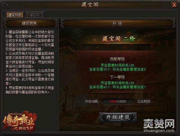 本次更新中,37《传奇霸业》新增公会建筑-藏宝阁,开服60天后,打开公会-建设界面,消耗一定数量公会物资即可解锁。