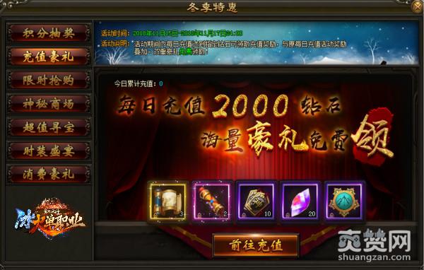 11月15日-17日,每日充值达指定钻石数额,即可领取充值奖励,可在原来的每日充值奖励叠加领取。还有两档豪礼可供领取:2000钻石、20000钻石。每档都有丰厚豪礼,心动就行动吧!