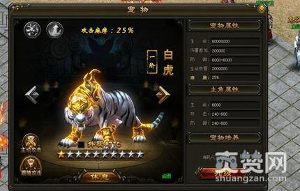 当各位大侠13级时,便可激活宠物系统,直接拥有一阶宠物白虎。在宠物系统中,左侧显示主动攻击/跟随攻击、空白星星,右侧则显示宠物属性(生命、伤害追加、防御、生命恢复、麻痹)主角属性(生命、攻击、防御),宠物培养(显示消耗元宝数量),还有升级按钮。