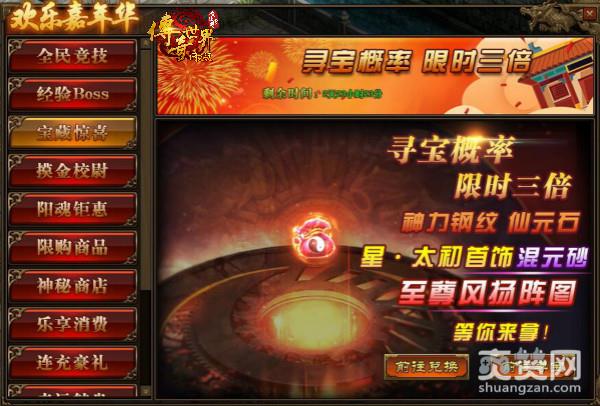 玩家寻宝概率翻倍,极高几率获得星太初首饰,仙元石、混元砂,神力特戒钢纹,传世灵器、传世灵甲以及至尊风扬阵图。宝藏大放送,惊喜连连看,今天最后一天!祝大家好运!