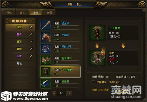 相对而言,我去玩《火烧连营》武器和坐骑魔化之后提升的战力更多,所以有足够魔化资源时应优先考虑它们。其次可考虑的是腰牌和兵书,能增加兵力属性值,对提高征战获胜率有很大的好处。最后是护甲和饰品,因为防御属性对战力加成不大,所以可以把它们的魔化顺序放到最后。