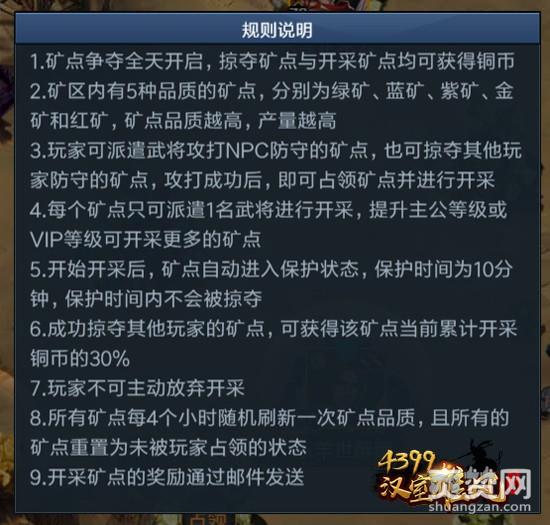 矿点收益,在玩家武将被下矿时获得(如:矿点等级刷新、被其他玩家打败),玩家不能放弃矿点。