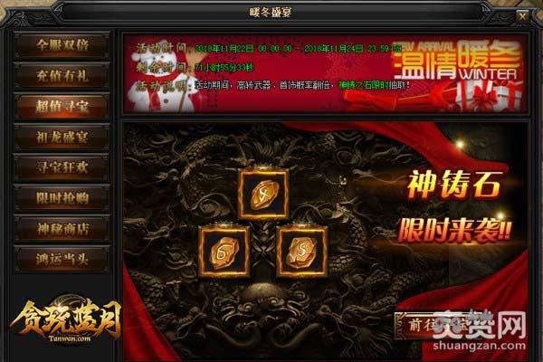 当感恩节遇上《贪玩蓝月》暖冬盛宴,会擦出什么惊喜呢?让我们来看一下吧!在11月21日~11月27日《贪玩蓝月》暖冬盛宴期间,八大惊喜福利来袭!活动第一天,全服双倍经验活动全天开启,海量经验轻松得。还有高转武器、首饰概率翻倍,神铸之石限时抽取!在龙族寻宝中,每寻宝5次,可额外获得1点祖龙之力,获取无上限,寻宝次数达指定次数,即可额外大礼!心动不如行动,一起来寻宝吧!
