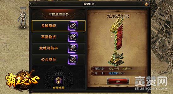 威望可以通过四种途径获得:威望任务、龙城争霸、激情闭关、巅峰王者。其中威望任务可以快速获得大量威望,威望任务有龙城旗帜、军需物资、龙城弓箭手、公会成员四种,每种任务每天可完成一次。