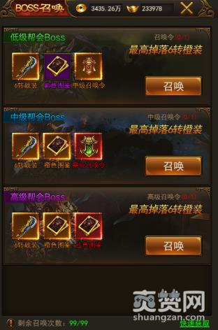 帮会BOSS中包括BOSS召唤与BOSS试炼玩法。BOSS召唤分为低级、中级、高级三类,消耗对应的召唤令即可召唤BOSS,击败召唤的BOSS后可获得丰厚奖励,有一定概率获得传奇BOSS图鉴包。