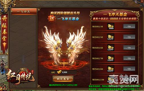 新服基金分为两种,一种为“一飞冲天基金”。基金内容为,新服创号后48小时内,花费8888元宝购买4阶翅膀直升丹【3阶翅膀使用】可以获得以下返利。