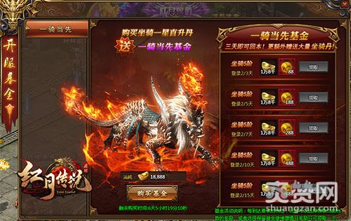 第二种基金为“一骑当先基金”,坐骑基金将在新服8天后开启,基金内容为:花费18888元宝购买坐骑一星直升丹可以获得以下返利,基金开启后,会随着天数增加领取奖励,领取条件为坐骑达到五阶。