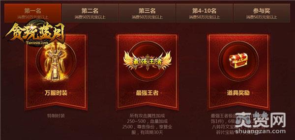 11月28日-11月30日《贪玩蓝月》最强王者争夺赛火热开启,消费总额满50万元宝的玩家(前十名)将把自己的名字载入蓝月传奇”最强王者”史册,排名前十的玩家将会获得所在服务器冠名权,如果同一服务器有2位以上玩家满足条件,则取高位的玩家,有效期:30天。更有特制时装、最强王者称号、超豪华道具礼包奖励哟!