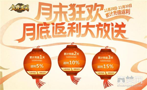 《贪玩蓝月》月末返利活动与最强王者活动同步开启,贪玩蓝月的所有玩家在活动期间,参与活动,每天充值500元起,累积充值1天,返利5%;累积充值2天,返利10%;累积充值3天,返利15%,并统一在第二天进入活动界面点击领取相应累计充值天数的返利。