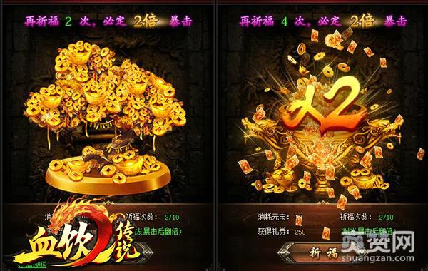 《血饮传说》中有四种货币:金币、元宝、礼券和玛法货币,当中的每一种都大有用处。当我们缺金币和绑元的时候,就可以去寻求“祈福系统”的帮助,在这里玩家每天可免费祈福金币和礼券各两次。2次后可消耗元宝进行祈福,获得大量金币和绑元。祈福过程中有概率触发暴击,暴击后玩家获得的奖励翻倍。
