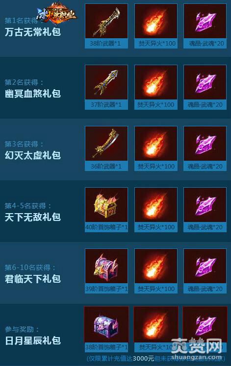 不差钱的土豪玩家看这里!活动期间消费总额满30W钻石以上的玩家可参与竞争前十名的高级装备奖励,消费总额满30W钻石以上,且不在前十名内的玩家可获得参与奖励!礼包与福利齐飞~