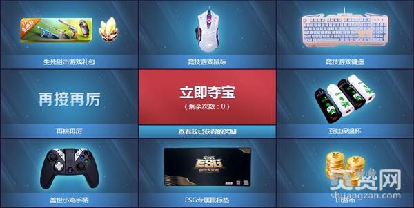 夺宝奖励各种爆款,包括生死狙击游戏礼包(武器通用卷(3天)黄水晶*20)、竞技游戏键盘、ESG专属鼠标垫、竞技游戏鼠标、豆娃保温杯、盖世小鸡游戏手柄、10游币。